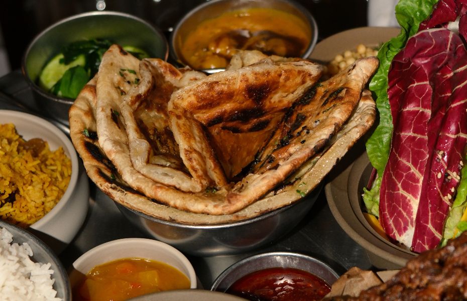 Menukortet tager udgangspunkt i en generøs thali: et indbydende fad med 10-12 småretter, primært plantebaserede, som tilbyder en bred introduktion til Sydasiens krydrede og aromatiske køkken. Her er alt fra curries og chutneys til friskbagt naan. En thali koster 150 kr. per person, og man kan nemt udvide måltidet med ekstra lækkerier – som saftige samosaer, grillet lammekrone og en intens pork cheek vindaloo.